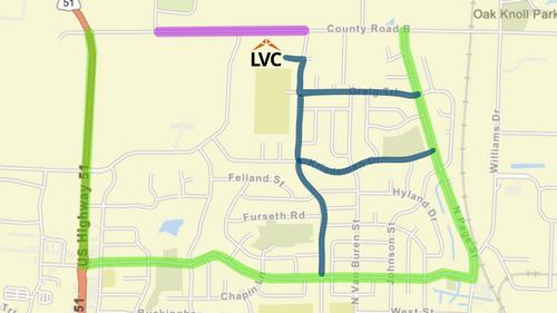 The detour shown on the map is US Highway 51 to Roby Road to Page Street (shown in green). LakeView Church will be accessible via the detour route: Roby Road to Lincoln Avenue, or Page Street to Greig Trail and Kriedeman Drive (routes shown in blue).